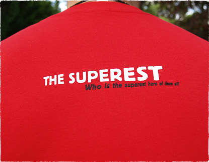 Printed on 100% cotton, American Apparel, Red. Comes in Men's and Women's sizes. "The Superest" is printed on the back. This shirt will attract bulls, so be careful.